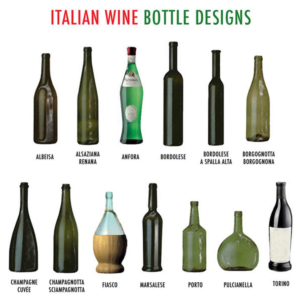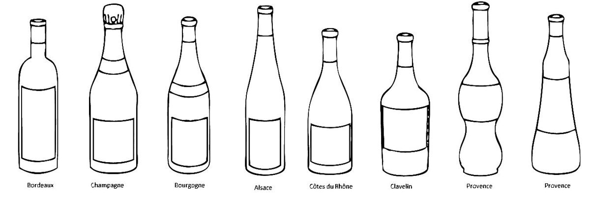 In base alla forma ogni bottiglia ha il suo nome, che prende origine dal vino o dalla zona di produzione.
