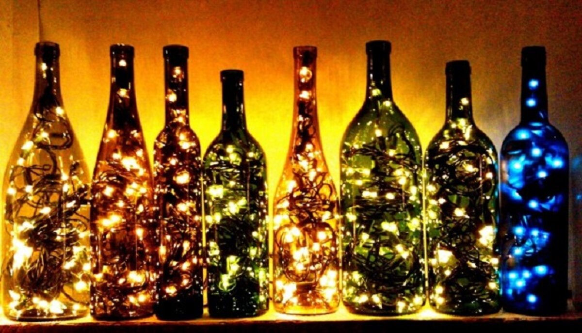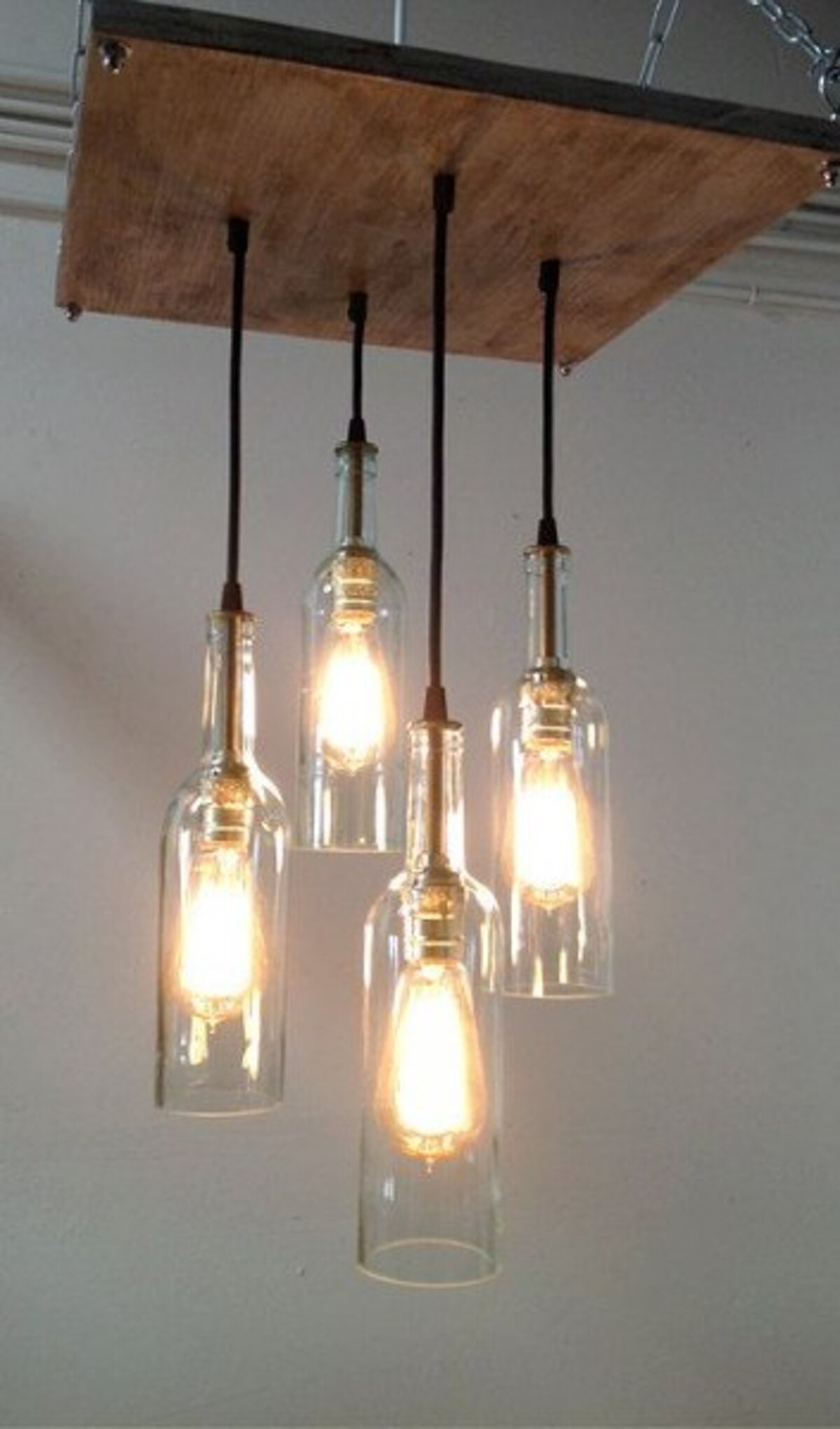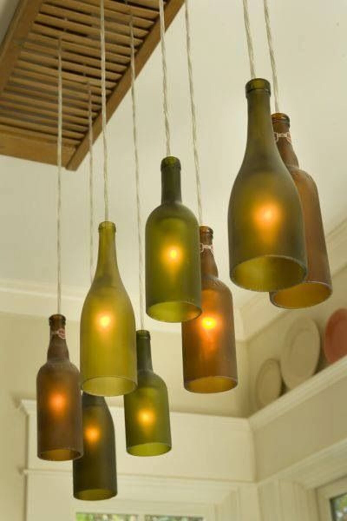 Tagliate o no, le bottiglie di vetro possono essere impiegate per la realizzazione lampade e lampadari molto originali.
