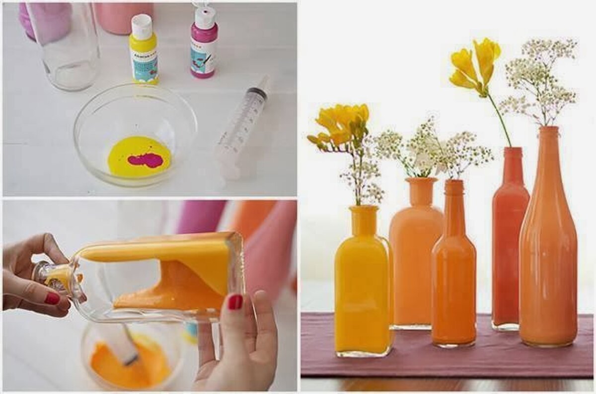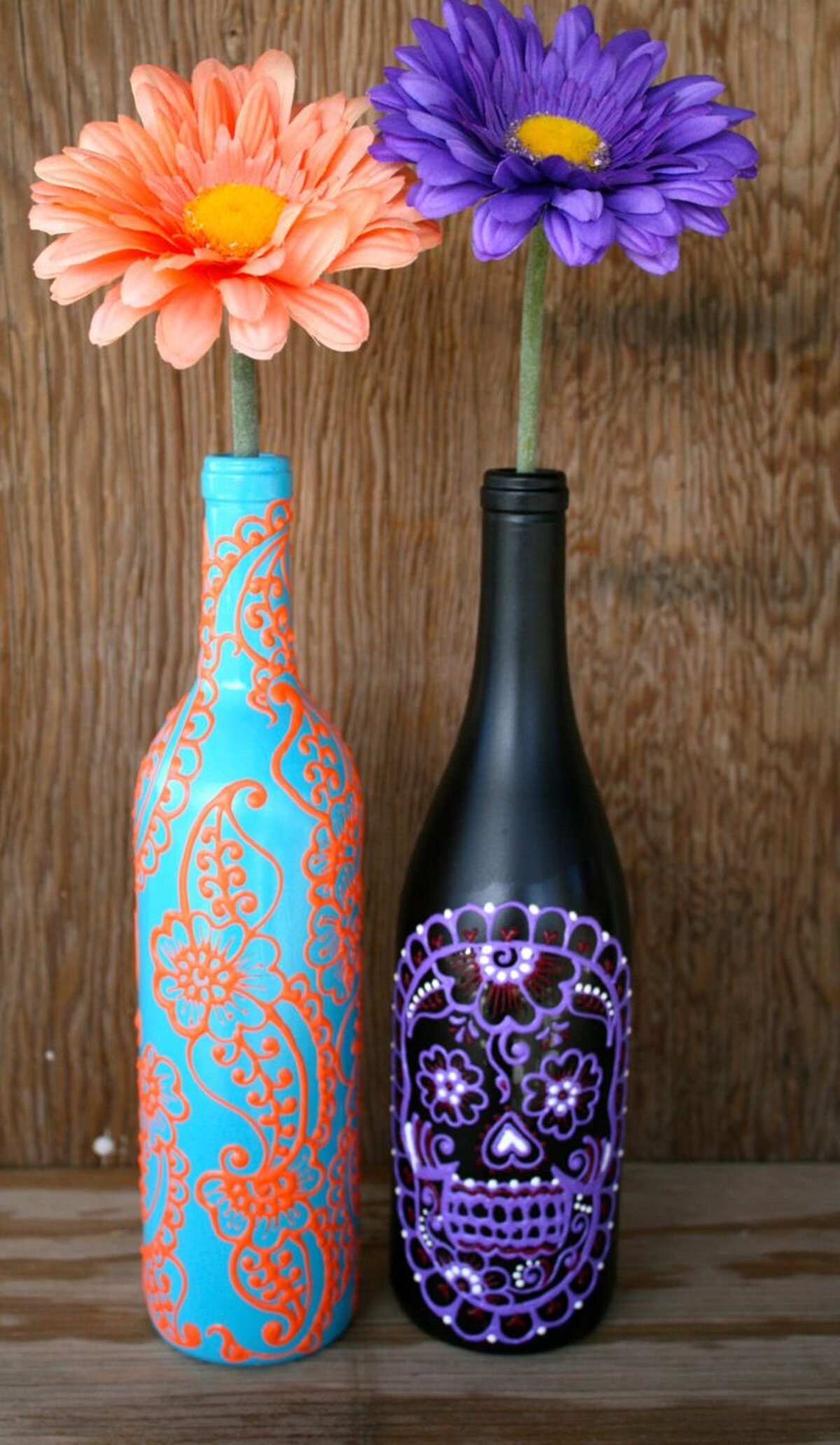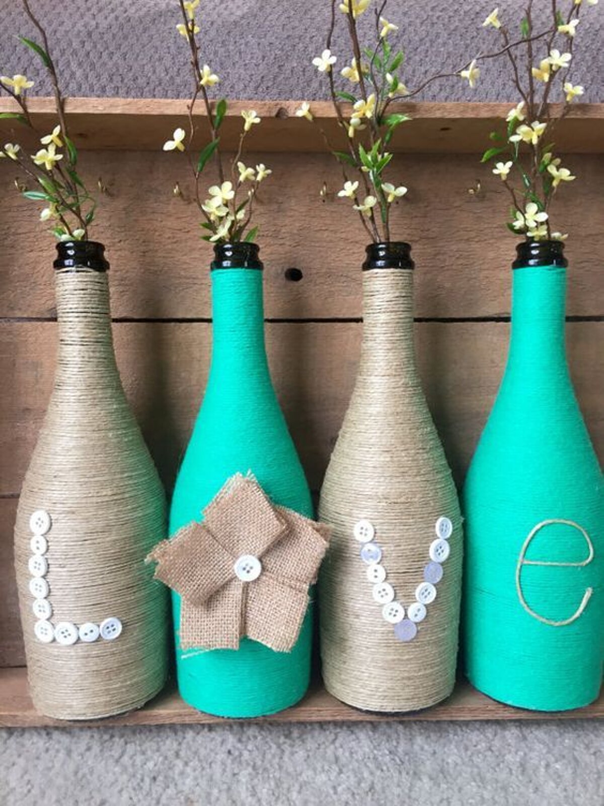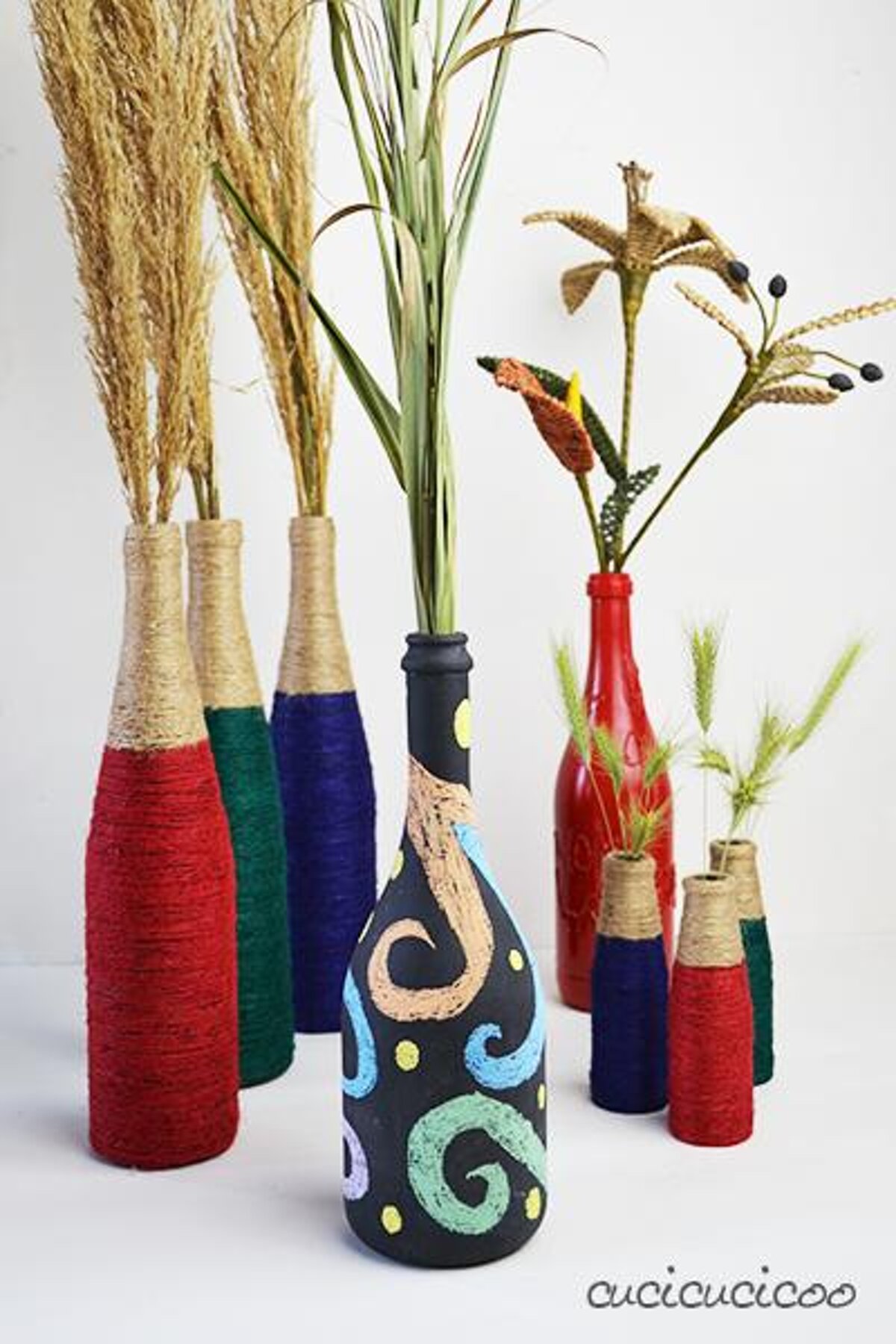 Opportunamente decorate le bottiglie di vino posso diventare dei portafiori molto eleganti e decorativi. Possono anche essere appese al muro e si può giocare con le varie forme e dimensioni.
